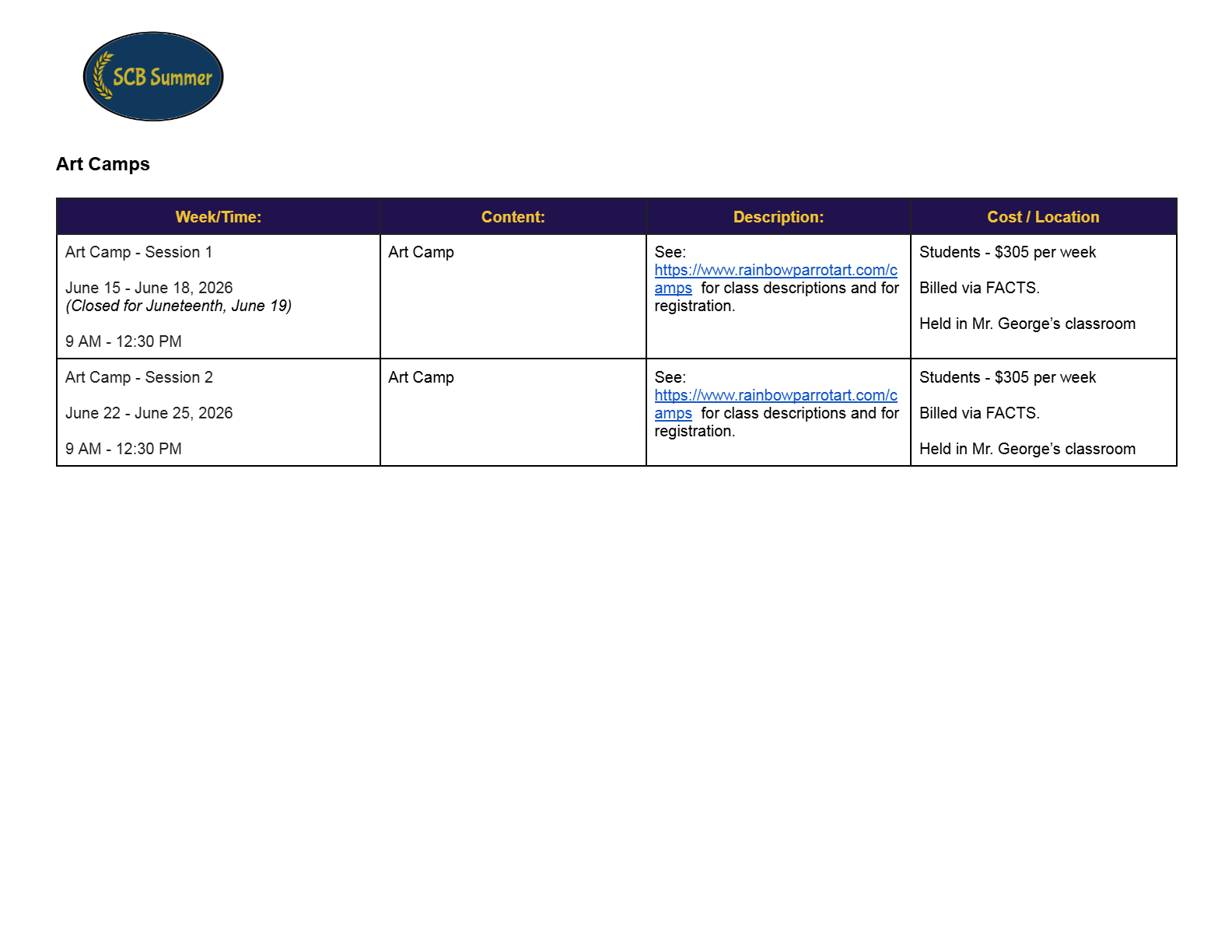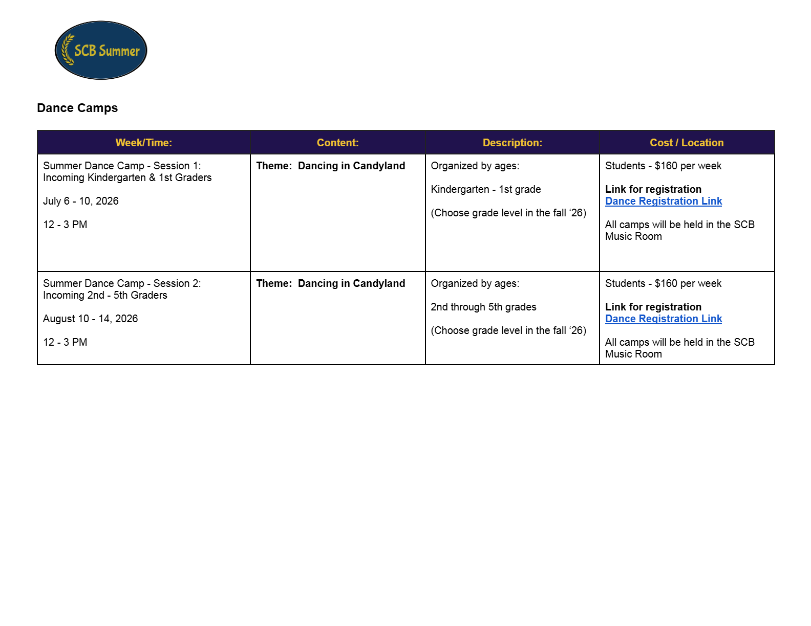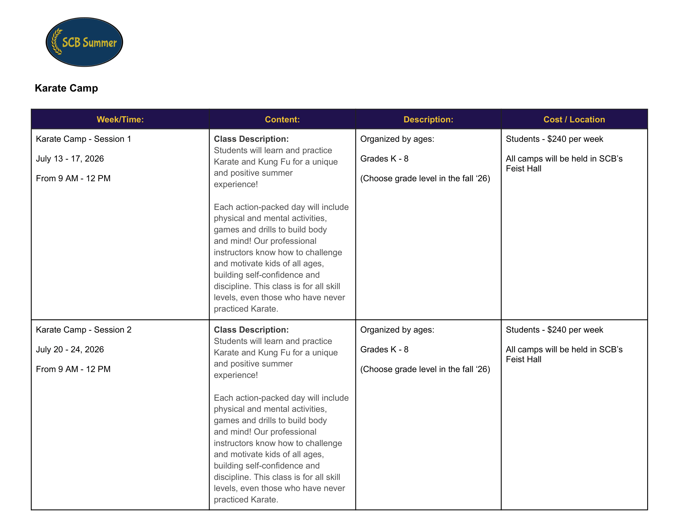 2026 SCB Summer Camp Programming