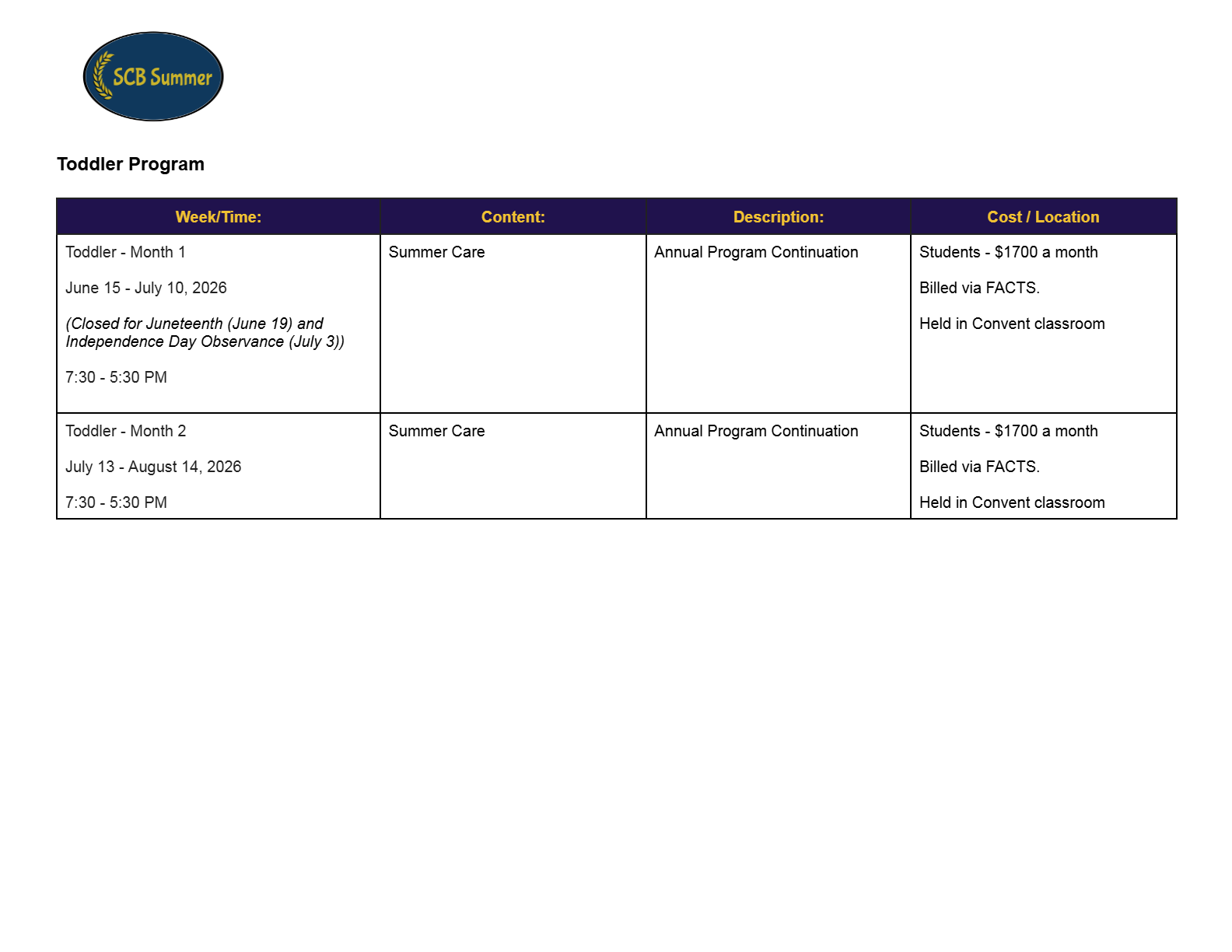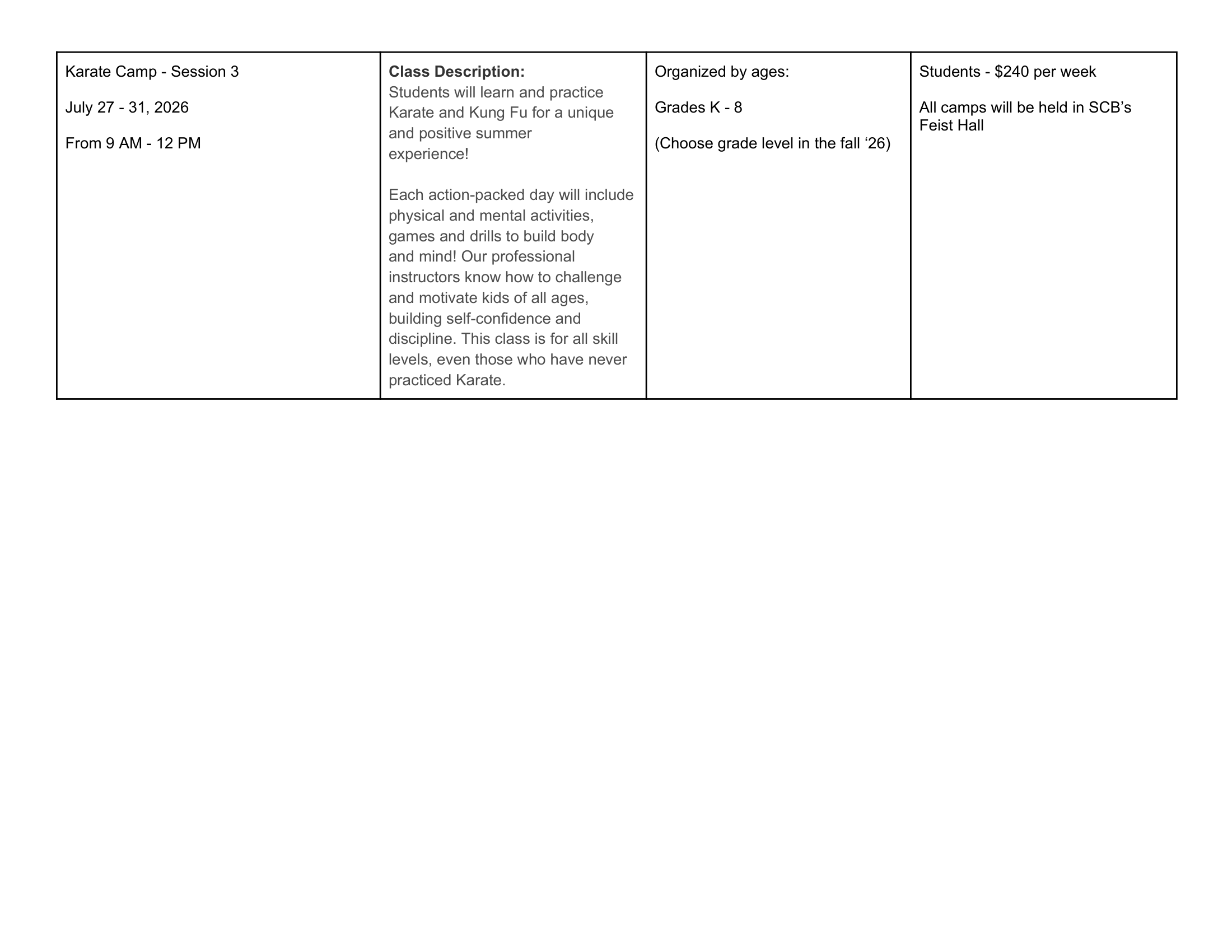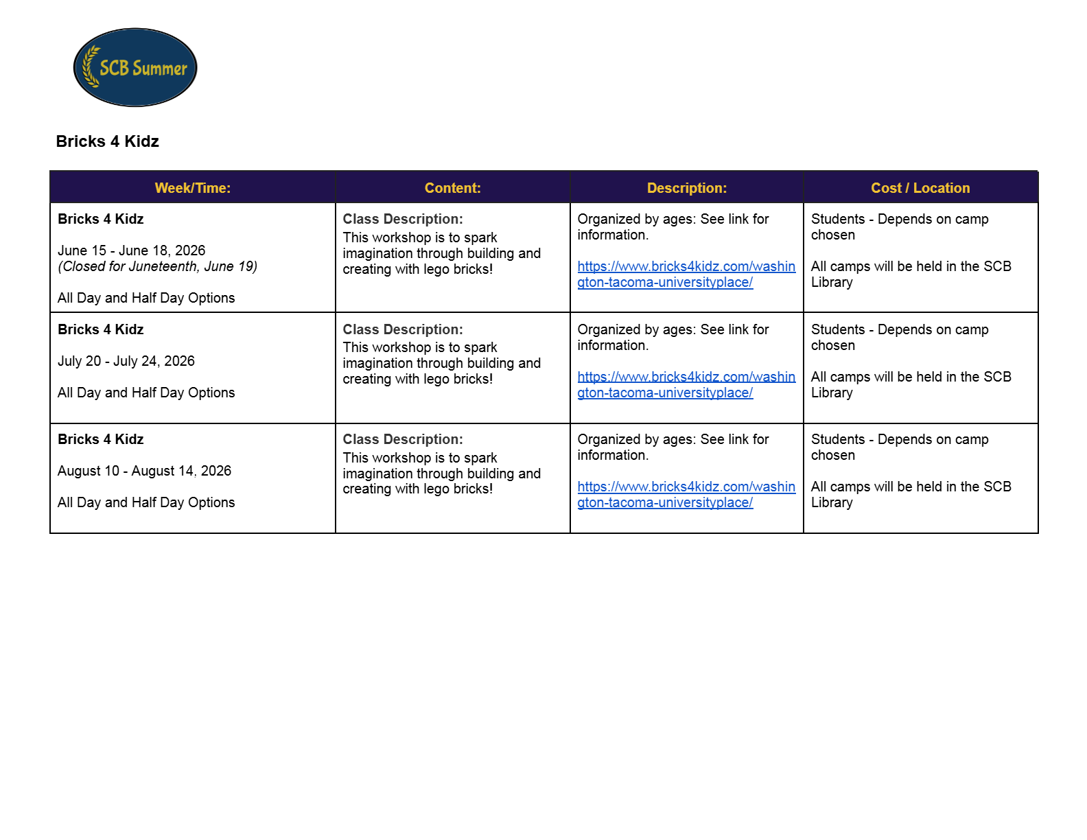 2026 SCB Summer Camp Programming